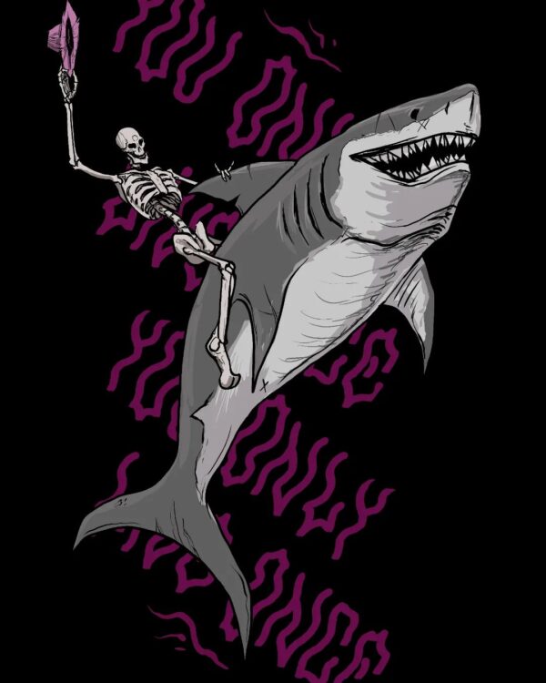 This tee isn’t just clothing—it’s an attitude. The skeleton, stripped of flesh but never of swagger, symbolizes living beyond fear, embracing every wild ride until the last breath. The shark, savage and unstoppable, embodies raw energy, dominance, and survival instinct, a reminder that true rebels don’t just float—they dominate the waters. Together, they form an image of chaotic freedom, a surreal mashup that instantly commands attention. Worn across the full back in sharp, bold detail, this design is a celebration of misfits, thrill-seekers, and those who live every day like it’s their last.